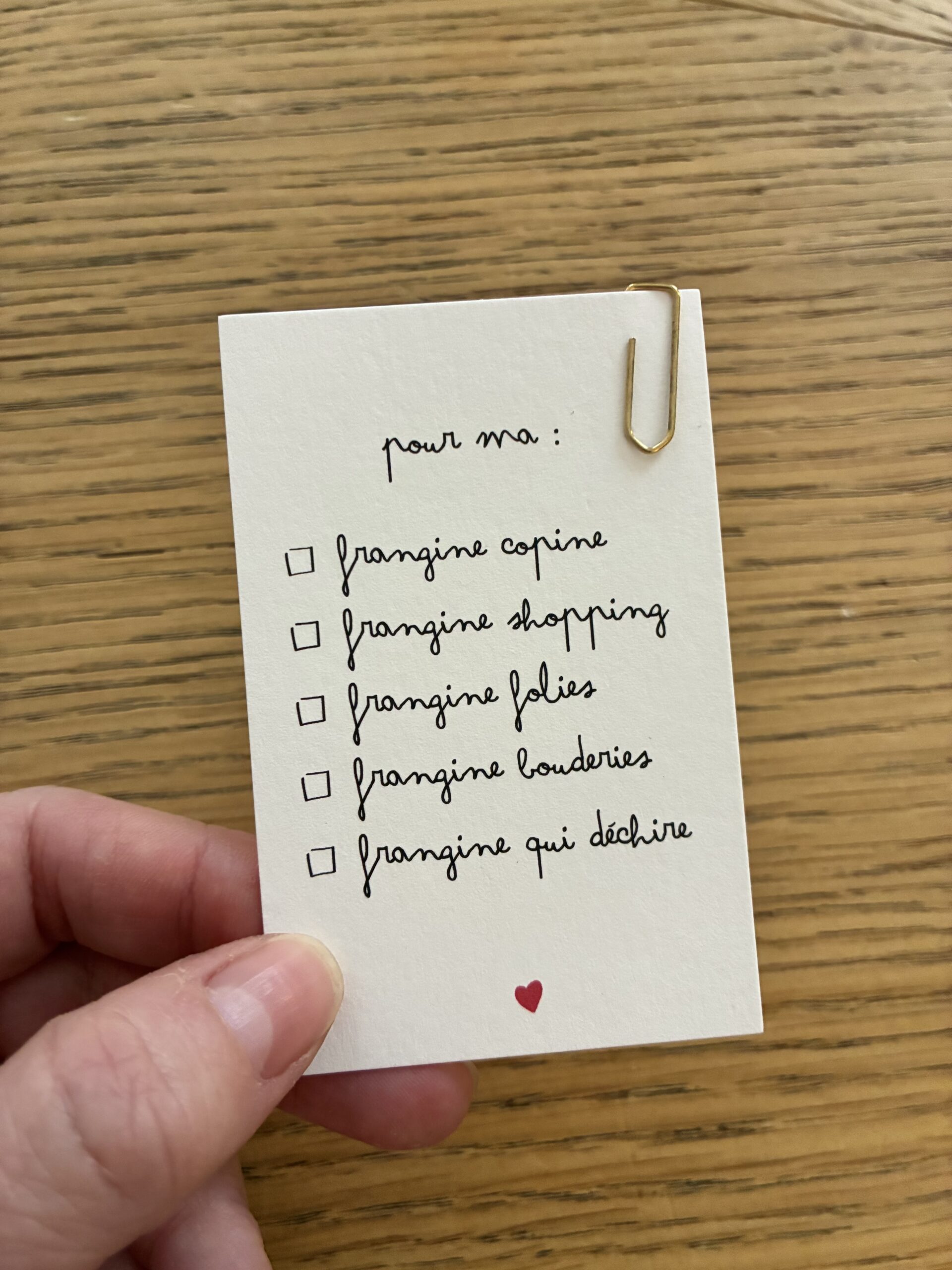 Cette carte est vendue avec une épingle à nourrice dorée pour pouvoir l’accrocher à un bouquet ou un paquet cadeau.